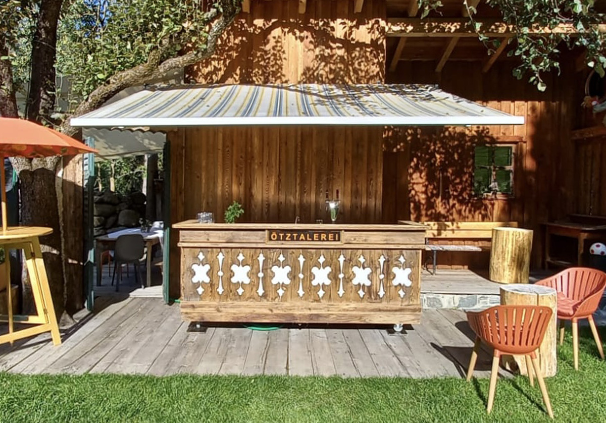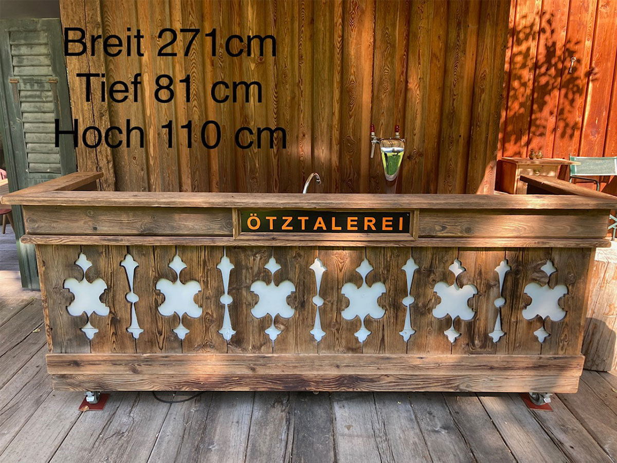 Besonders stolz sind wir auf unseren selbstgebauten und rustikalen Barwagen der mit Schirm, Zapfanlage, Wasser- und Stromanschluss ausgerüstet ist. Dieser einzigartige Wagen vermittelt Gemütlichkeit und Tradition.
